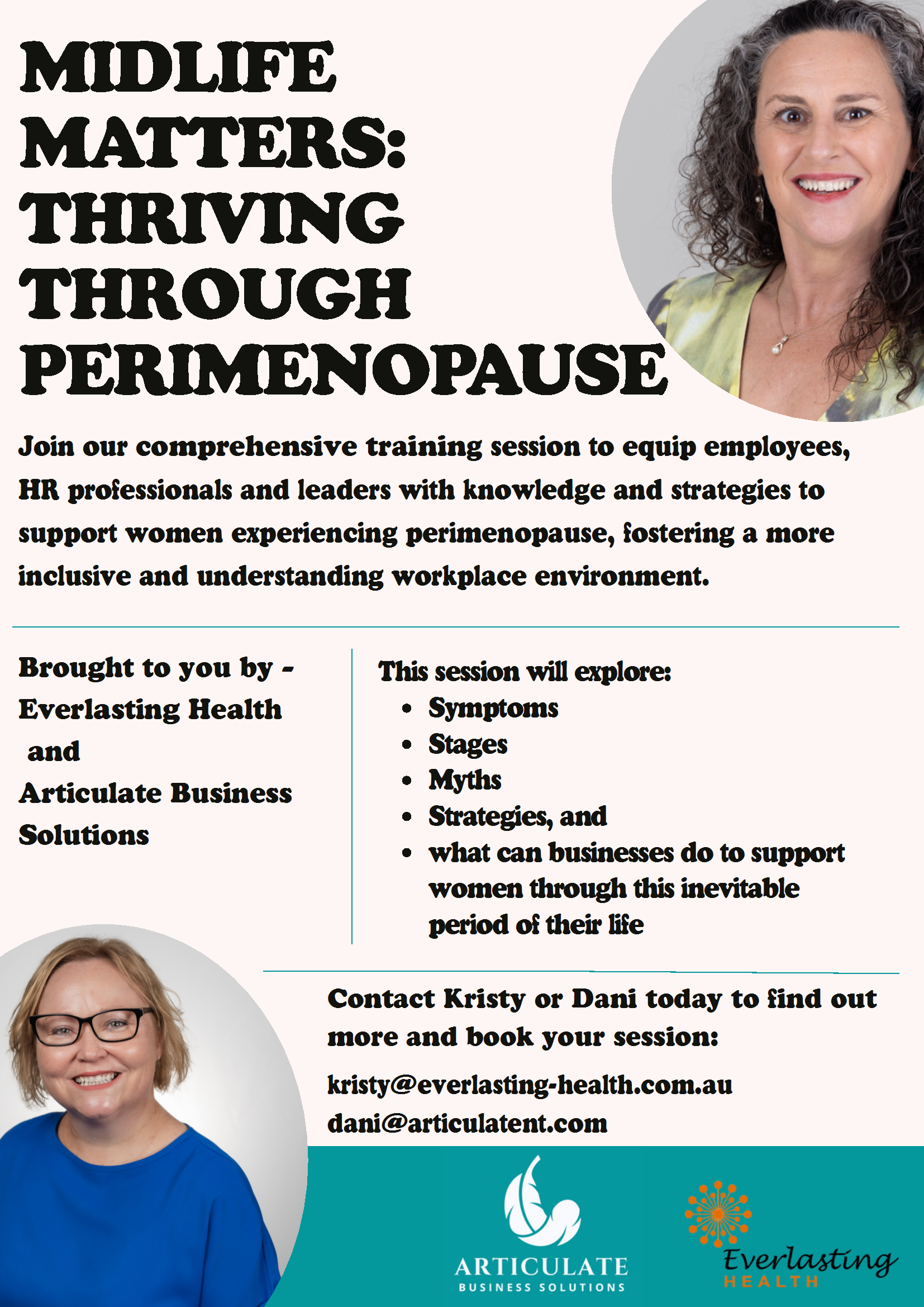 This OBM (October Business Month) we are pleased to introduce a unique training program that bridges the often-overlooked intersection of women’s health and workplace wellbeing: Midlife Matters, Thriving through Perimenopause. About the Facilitators:Kristy brings over...